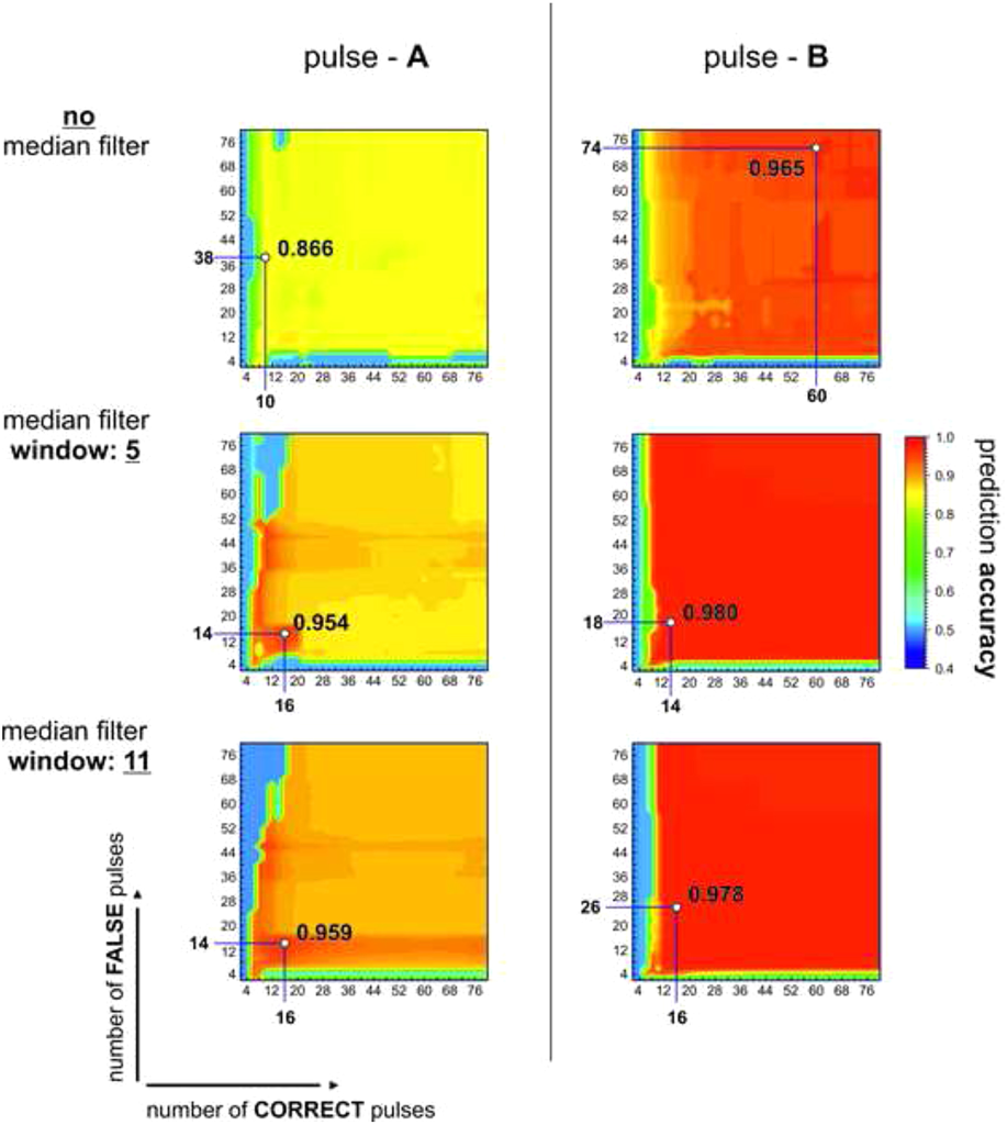 In the following, the evaluation of each learned classifier corresponding to a specific set of parameters on the grid was obtained from the same number of about 8000 pulses of the testing dataset for each class (correct and false pulses) of the respective detectors A and B. As indicated in the figure below, a significant improvement of about 9.3% in the prediction accuracy was achieved for the pulses of detector A by applying median filtering using a window size of 11. However, only slight improvements of about 1.5% in the prediction accuracy were achieved for detector B using a window size of 5, whereby its initial prediction accuracy, i.e. without median filtering, and its optimized prediction accuracy are considerably higher with respect to detector A of about 9.9% and 2.6%, respectively. Furthermore, it can be observed for both detectors A and B that the highest prediction accuracies are already obtained at a very low number of learned correct and false pulses (<20 pulses) by applying median filtering (window sizes: 5 & 11). This is typical for naive Bayes classifiers and a significant advantage of using this approach.