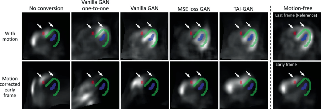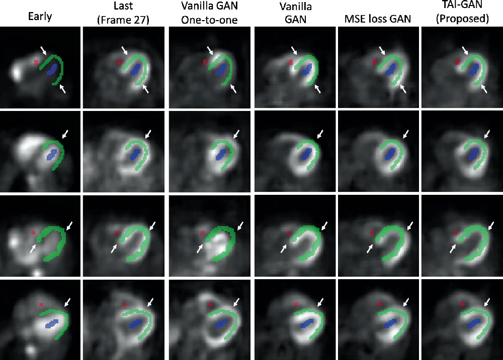 Results: The model’s reference study presented results demonstrating that TAI-GAN can produce converted early frames with high image quality, comparable to the real reference frames. After TAI-GAN conversion, motion estimation accuracy and clinical myocardial blood flow (MBF) quantification were improved compared to using the original frames.