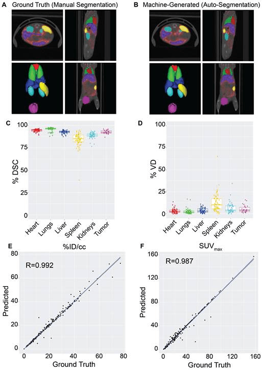 Results: NanoMASK produced 3-dimensional contours of the heart, lungs, liver, spleen, kidneys, and tumor with high volumetric accuracy (pan-organ average %DSC of 92.5). NanoMASK’s auto-segmentation performed very well following 5-fold cross validation. Machine-generated contours were easily visualized alongside the base PET/CT data and appeared virtually indistinguishable when viewed next to the ground-truth contours as illustrated below. When quantitatively assessed, machine-generated contours displayed high spatial overlap with ground-truth contours for all organs tested.