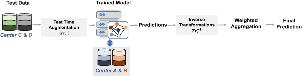 The adopted test time augmentation approach, involves the training of the model on data from center A and B. Test data includes data from centers C and D
