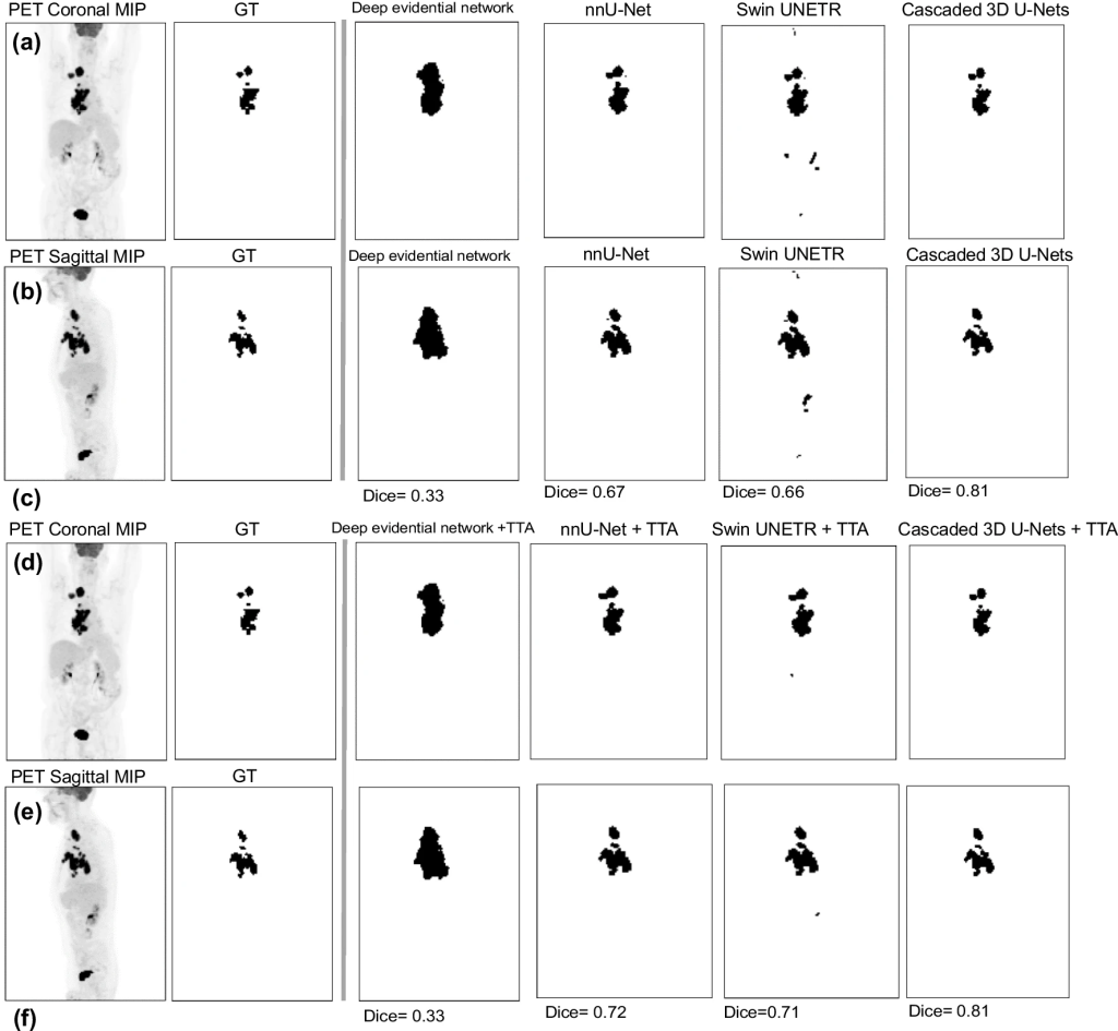 Results: The cascaded soft-voting guided approach resulted in performance with an average DSC of 0.68 ± 0.12 for the internal test data from developmental dataset, and an average DSC of 0.66 ± 0.18 on the multi-site external data (n = 518), significantly outperforming (p < 0.001) state-of-the-art (SOTA) approaches including nnU-Net and SWIN UNETR. While TTA yielded enhanced performance gains for some of the comparator methods, its impact on our cascaded approach was found to be negligible (DSC: 0.66 ± 0.16). Our approach reliably quantified TMTV, with a correlation of 0.89 with the ground truth (p < 0.001). Furthermore, in terms of visual assessment, concordance between quantitative evaluations and clinician feedback was observed in the majority of cases. The average relative error (ARE) and the absolute error (AE) in TMTV prediction on external multi-centric dataset were ARE = 0.43 ± 0.54 and AE = 157.32 ± 378.12 (mL) for all the external test data (n = 518), and ARE = 0.30 ± 0.22 and AE = 82.05 ± 99.78 (mL) when the 10% outliers (n = 53) were excluded.