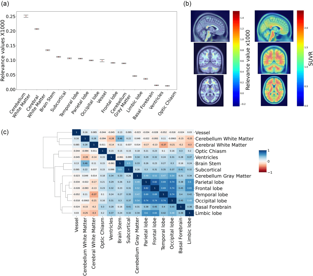 (a) Mean relevance values for brain regions and bootstrapped 95% confidence intervals. Values were multiplied by 1000. (b) Average relevance value and amyloid concentration (SUVR) for the dataset on PET scan. (c) Heatmap of Pearson correlations for relevance values of all brain regions.