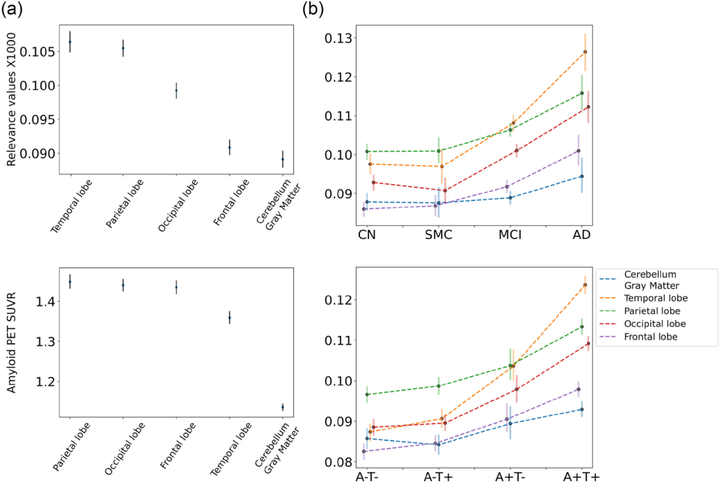 (a) Mean relevance values (top) and amyloid concentration (bottom) for grey matter regions and bootstrapped 95% confidence intervals. (b) Relevance level of grey matter regions on different clinical (top) and biological classes (bottom) of AD.