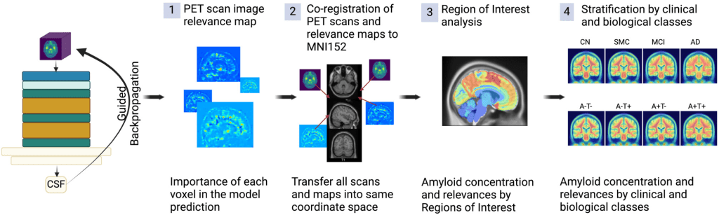 Evaluation: To examine their approach, the developers compared their method’s performance with SUVR, a measure that determines cortical amyloid aggregation in relation to the cerebellum, a commonly used reference region (Ext. Ref.; Ext. Ref.). The model was also studied in relation to episodic memory including immediate and delayed recall measures. The developers further investigated the model and brain regions separately in sub-groups based on both clinical and biological classification of AD. To scrutinize the trained neural network model, they extracted brain regions that the model considers informative for CSF prediction and compared them between clinical and biological classes.