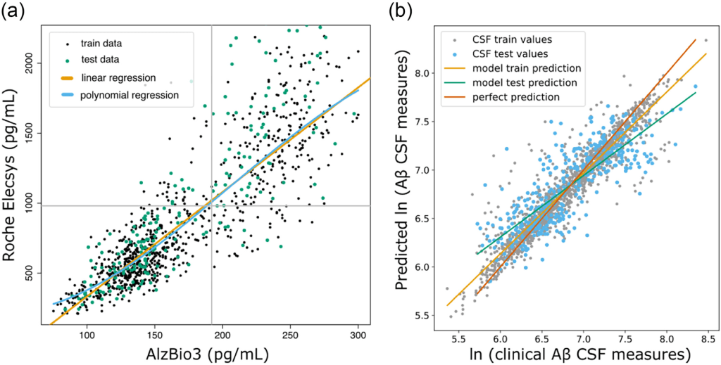 (a) Linear (orange line) and third-degree polynomial (blue line) regression for fluid amyloid rescaling from INNO-BIA AlzBio3 system to Roche Elecsys. Grey lines present cut-off values for Aβ CSF measurement. (b) Comparison of clinically measured Aβ CSF and values predicted by the ArcheD model. CSF values are given as natural logarithms. Lines illustrate the linear relationship between clinical Aβ CSF measurement and prediction of our model: green – linear relation between real and predicted values of the test dataset; orange – linear relation between real and predicted values of the training dataset. The red diagonal line shows the ideal one-to-one correspondence between observed and predicted values.