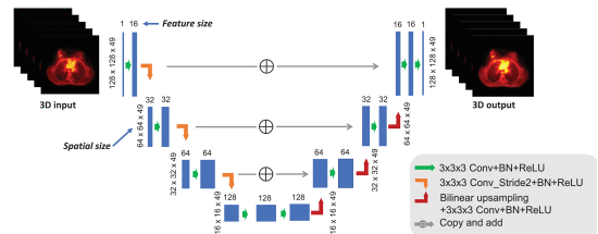 Claim: The model explores the potential of using existing inter-patient information via an iterative deep neural network to improve PET image reconstruction. The network structure is a combination of U-net structure and the residual network. Unlike existing CNN based image denoising methods, in this work a CNN was trained with iterative reconstructions of low-counts data as the input and high-counts reconstructions as the label to represent the unknown PET image to be reconstructed. Rather than feeding a noisy image into the CNN, the CNN is used to define the feasible set of valid PET images. According to the model developers, this is the first application of its kind for neural networks in medical imaging. The solution is formulated as the solution of a constrained optimization problem and sought by using the alternating direction method of multipliers (ADMM) algorithm.