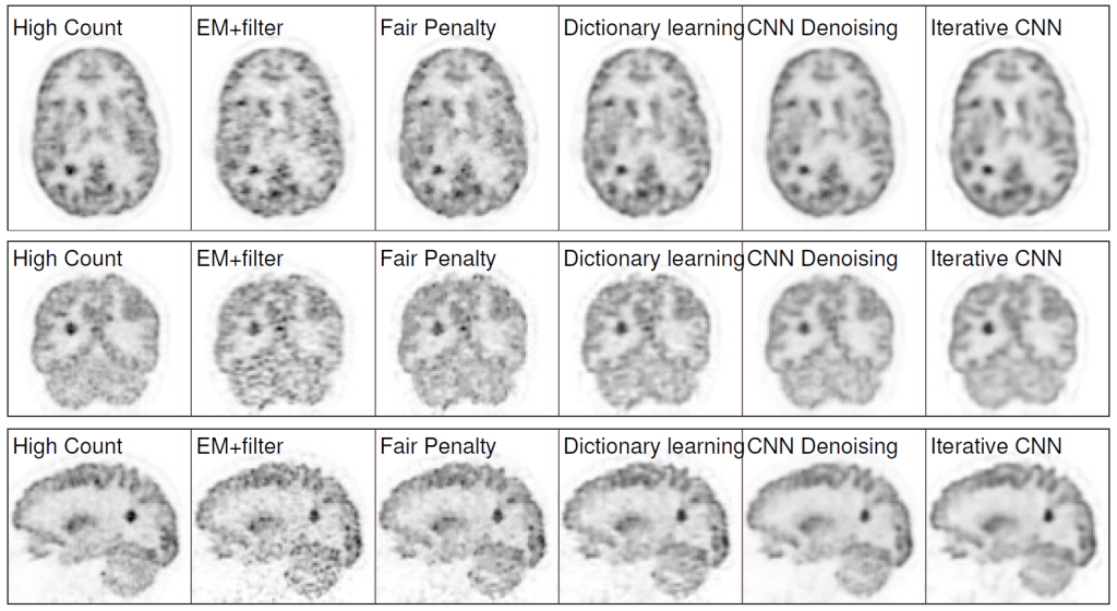 Results: Quantification results show that the proposed iterative neural network method can outperform the neural network denoising and conventional penalized maximum likelihood methods.