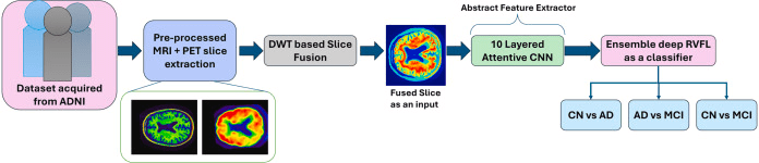 Task: Enhance the accuracy of Alzheimer’s Disease (AD) classification by (1) implementing a Multimodal Neuroimaging (PET-MRI) Fusion fremwork using Discrete Wavelet Transform (DWT) to seamlessly combines structural MRI with functional PET images, and (2) developing a sophisticated Convolutional Neural Network (CNN) for AD classification employing the ensemble method to effectively aggregates outputs from multiple randomized neural networks thus significantly boosting diagnostic accuracy, enhancing robustness, and attaining superior computational efficiency, to ensure practical applicability in clinical scenarios.