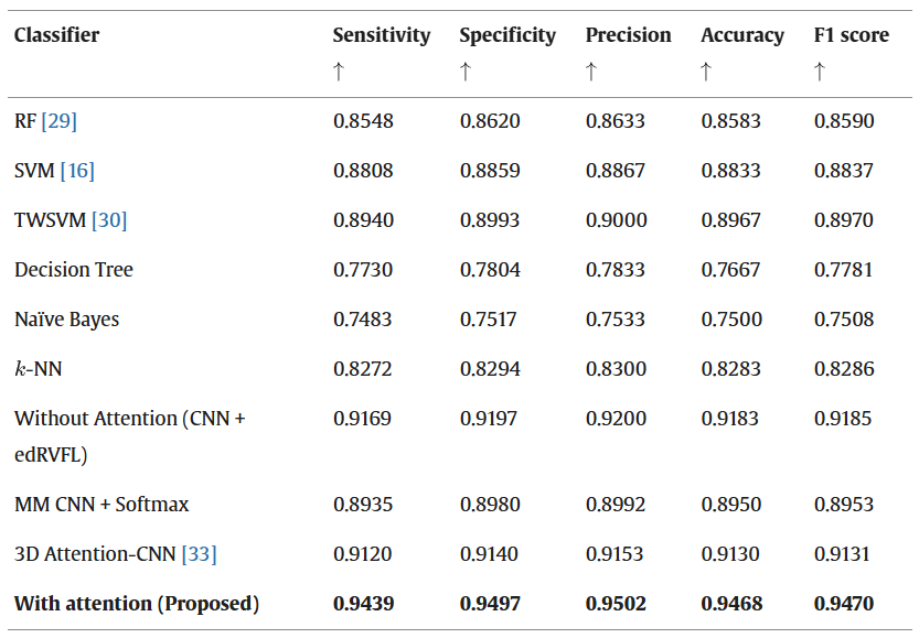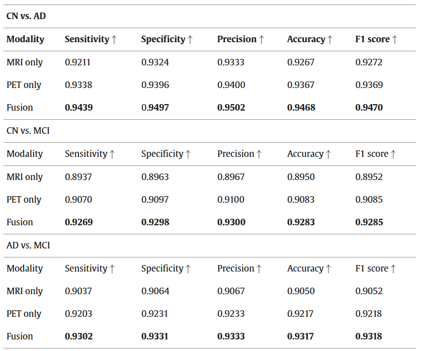 Results: Fusion performance: In this comparative analysis among PET, MRI, and fusion-based imaging techniques, attentive CNN is employed to process each modality, with the classification performed by an edRVFL network. The results, detailed in the table below encompass metrics such as accuracy, specificity, sensitivity, and precision.