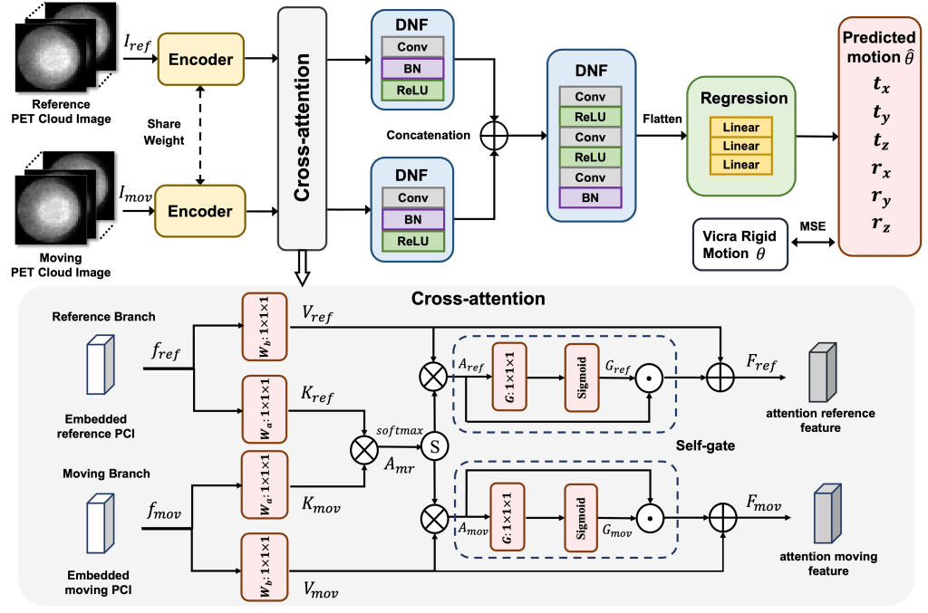 DL-HMC++ Framework: (Top) A shared encoder extracts imaging features from a pair of moving and reference 3D PET cloud images (PCIs). Then, the extracted features are fed into the cross-attention module to learn the correlation of anatomical features. Deep Normalization and Fusion (DNF) blocks refine the attention features both before and after concatenation. Finally, concatenated attention features are fed into a multi-layer perceptron Regression block to predict motion. (Bottom) Details of the cross-attention module