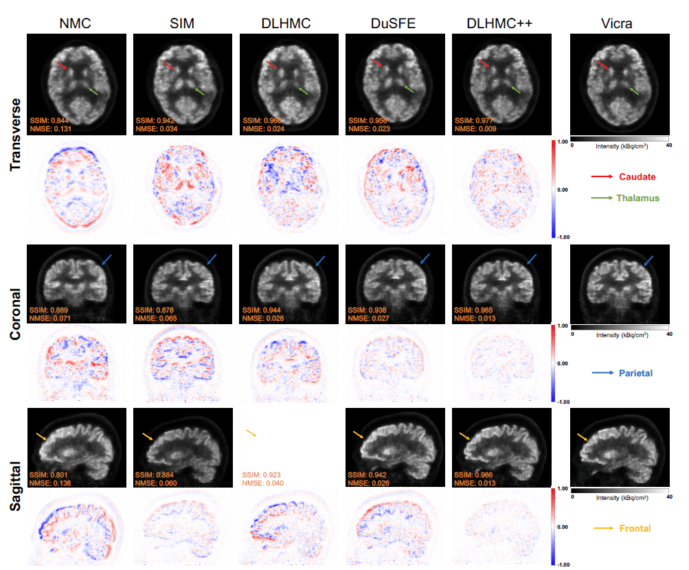 Remarks: The motion estimation methods in this study estimate transformation metrics from different images generated from PET raw data. Theoretically, motion parameters can also be directly estimated from sinograms, and it is feasible to employ deep learning algorithms for this purpose. However, part of their dataset includes TOF information, which causes the sinogram size to be much larger than the image size. In the future, the developers will explore the possibility of applying DL-HMC++ to other domains, such as sinograms and COD traces.
